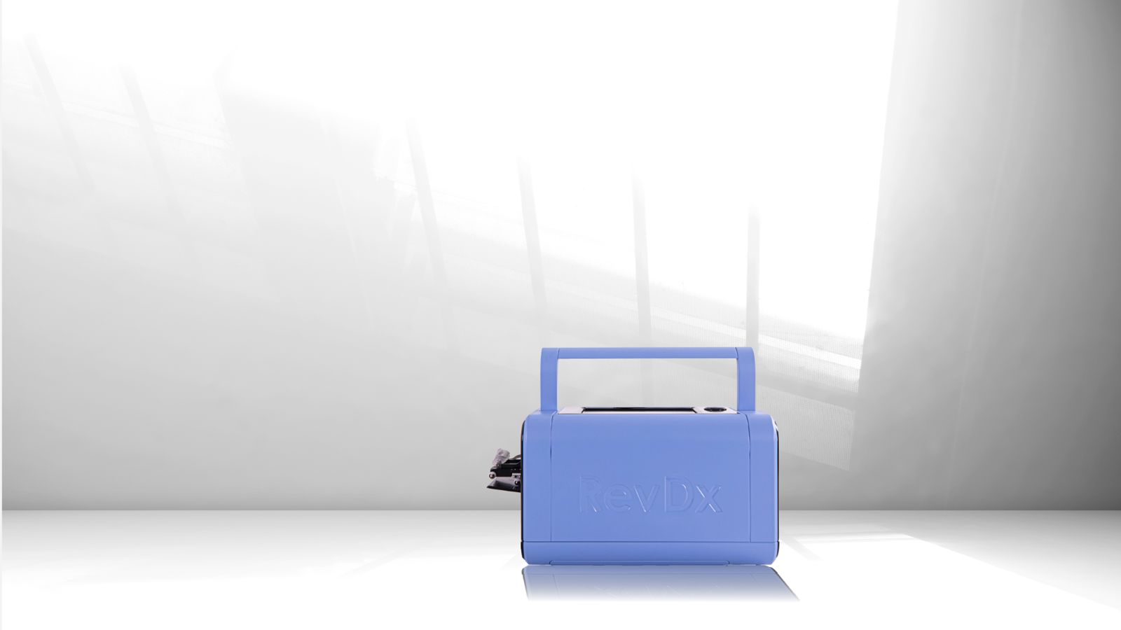 Healthcare professional collecting a blood sample from a patient’s finger, with a blue RevDX portable blood lab device in the background for analysis.